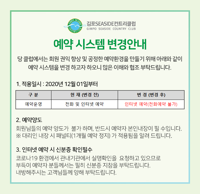 Home 정보마당 공지사항 공지사항 제목 예약 시스템 변경안내 작성자 관리자 작성일 2020.11.30 조회 14342 첨부파일 다음 글 [공지] 설 연휴 휴장으로 인한 3/12 예약 안내 이전 글 마스크 착용 의무화 목록으로