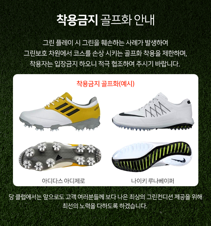 Home 정보마당 공지사항 공지사항 제목 착용금지 골프화 안내 작성자 관리자 작성일 2021.08.30 조회 13038 첨부파일 다음 글 수도권 사회적 거리두기 4단계 완화 방침에 따른 클럽 운영 안내 이전 글 사회적 거리두기 4단계 연장 클럽운영 안내 목록으로