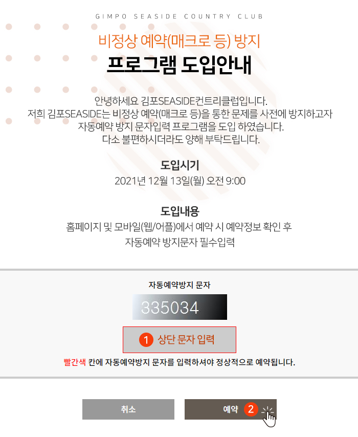 Home 정보마당 공지사항 공지사항 제목 비정상 예약(매크로 등) 방지 프로그램 도입안내 작성자 관리자 작성일 2021.12.14 조회 10250 첨부파일 다음 글 코로나 19 단계적 일상 회복 지침 클럽운영안내 이전 글 코로나 19 단계적 일상회복 지침 클럽운영안내 목록으로