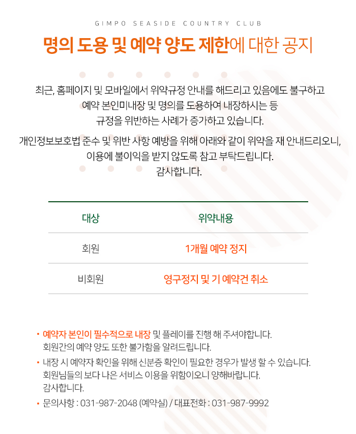Home 정보마당 공지사항 공지사항 제목 명의 도용 및 예약 양도 제한에 대한 공지 작성자 관리자 작성일 2022.04.20 조회 3896 첨부파일 다음 글 그린 통기 작업 안내 이전 글 캐디피 조정 안내 목록으로