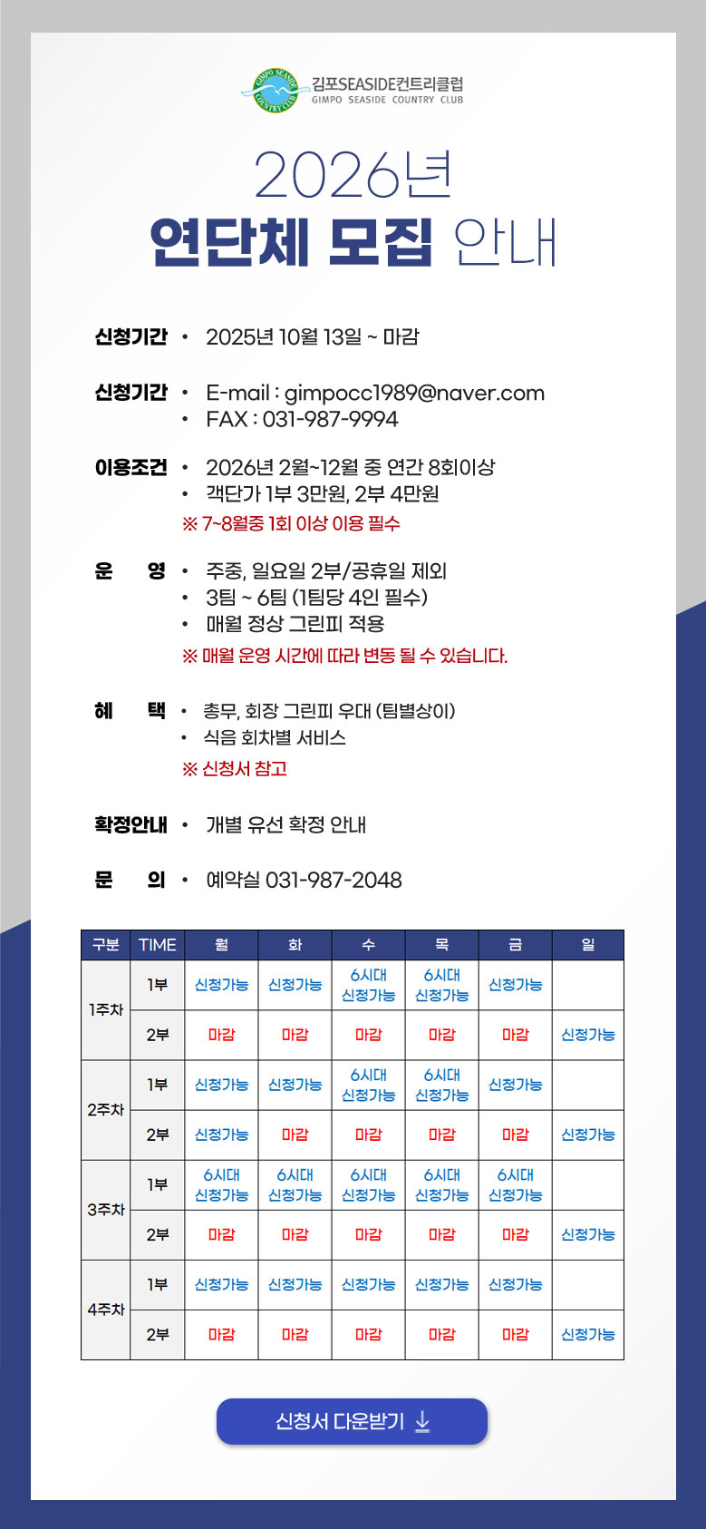 Home 정보마당 공지사항 공지사항 제목 2026년 연단체 모집 안내 작성자 관리자 작성일 2025.10.13 조회 2558 첨부파일 다음 글 김포CC 여성회원 QUEEN 골프데이 이벤트 마감 안내 이전 글 김포씨사이드 추석 인사 목록으로